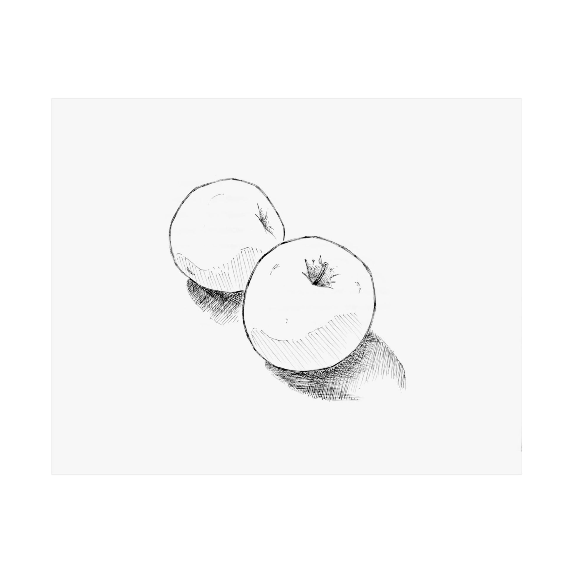 This matte horizontal poster brings a quiet, considered moment into your room — two apples rendered in black-and-white ink, their forms softened by projected shadows. The sketch feels like a study from a sunlit kitchen table: simple shapes, subtle contrast, and the hush of paper and pigment. Hung above a small table, leaned against a bookshelf, or grouped with other botanical prints, it creates a calm focal point that suits someone who values slow, deliberate objects and the warmth of everyday still life. The monochrome palette pairs easily with wood tones and warm neutrals, and the matte surface absorbs glare so the drawing reads clearly from different angles. For evenings when you want a room to feel more collected — or for a housewarming where the new space needs a gentle, thoughtful touch — this print settles in without shouting, inviting lingering looks and quiet appreciation.