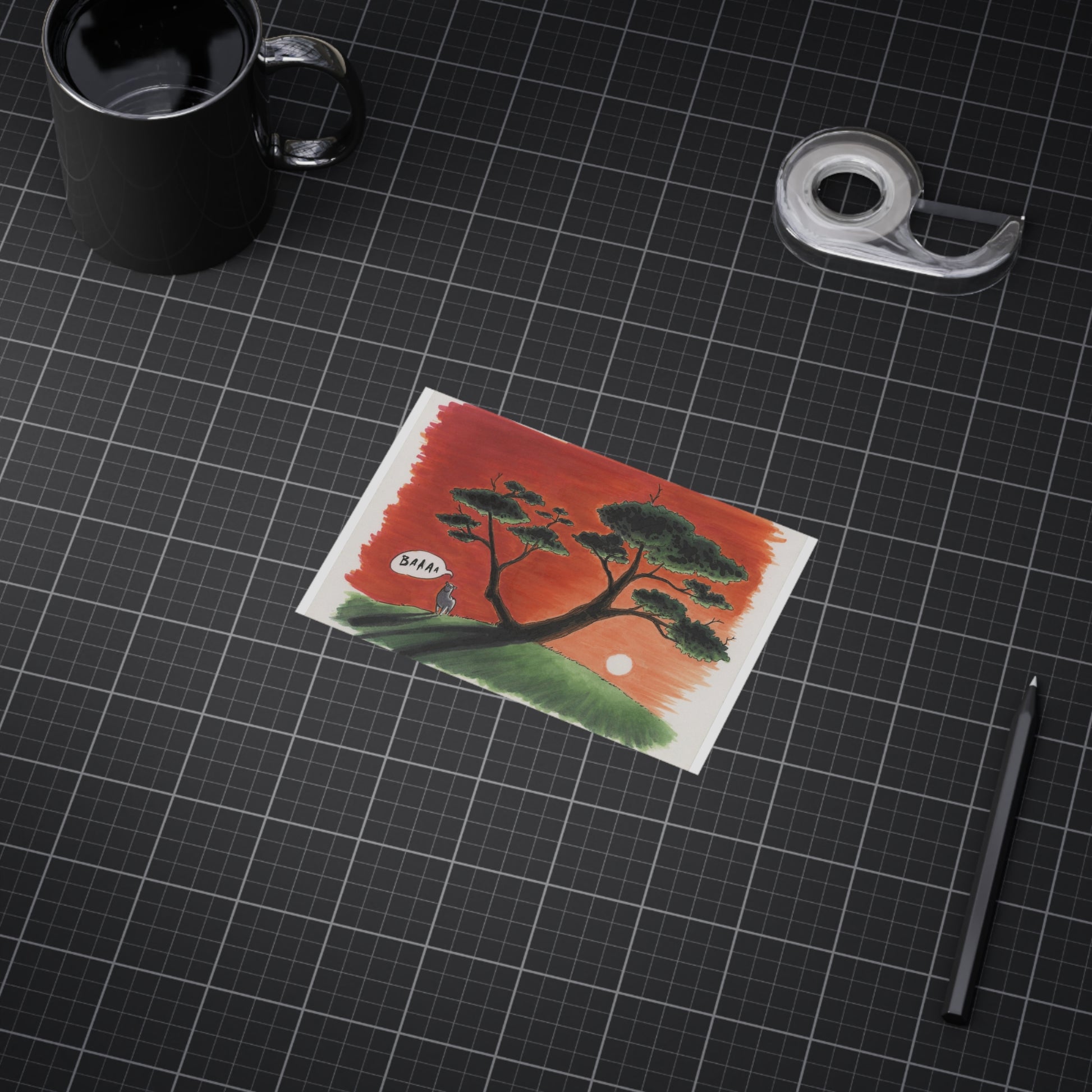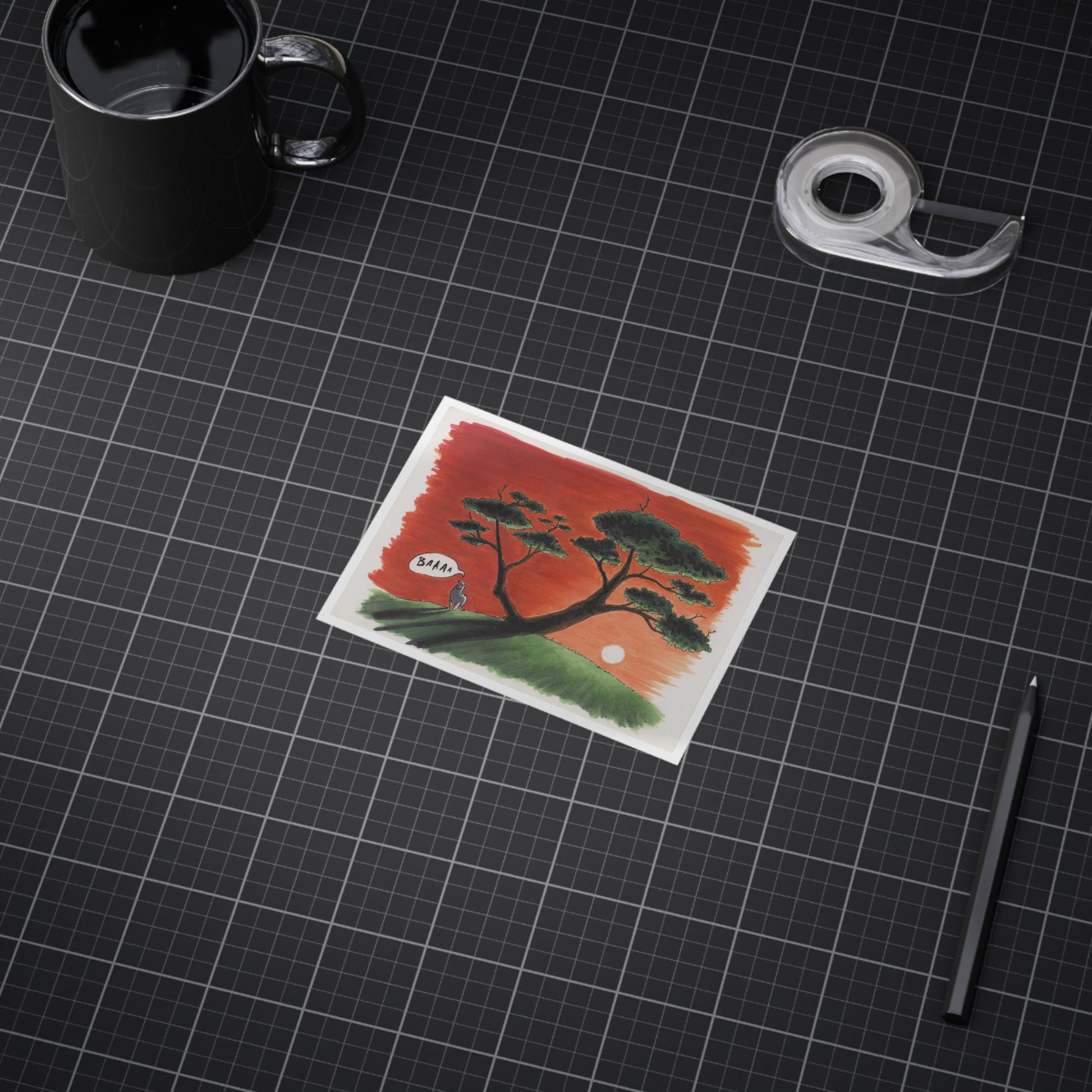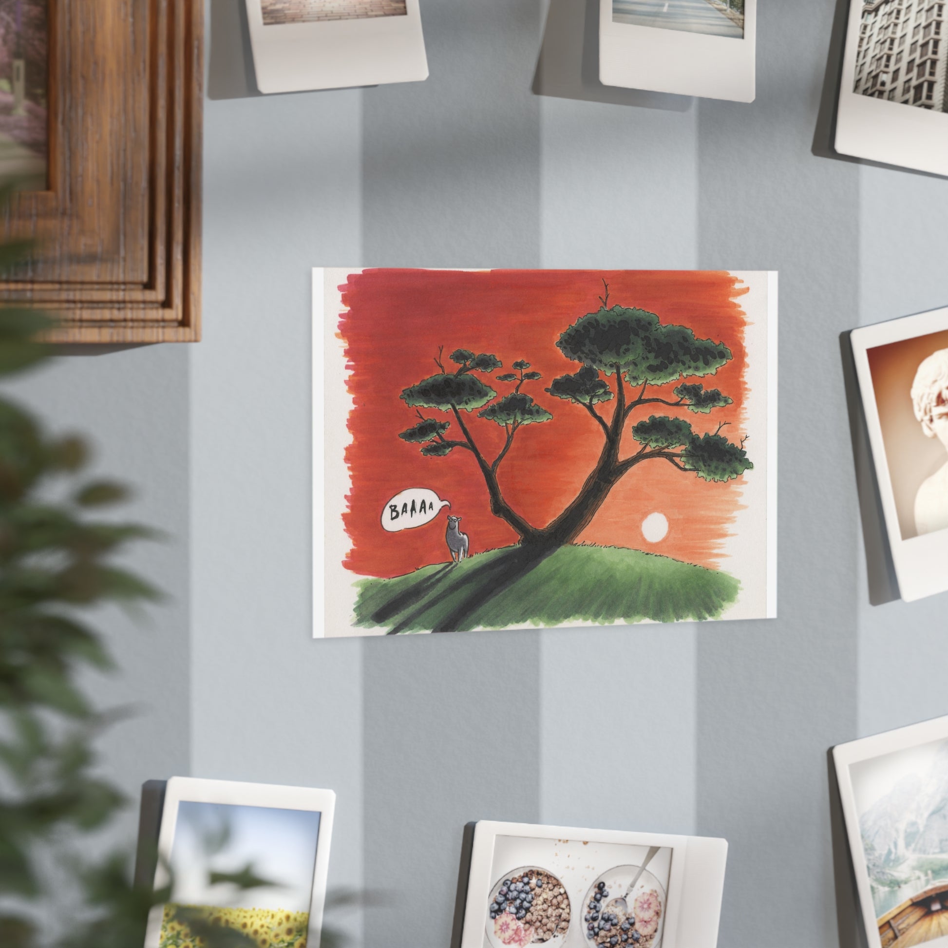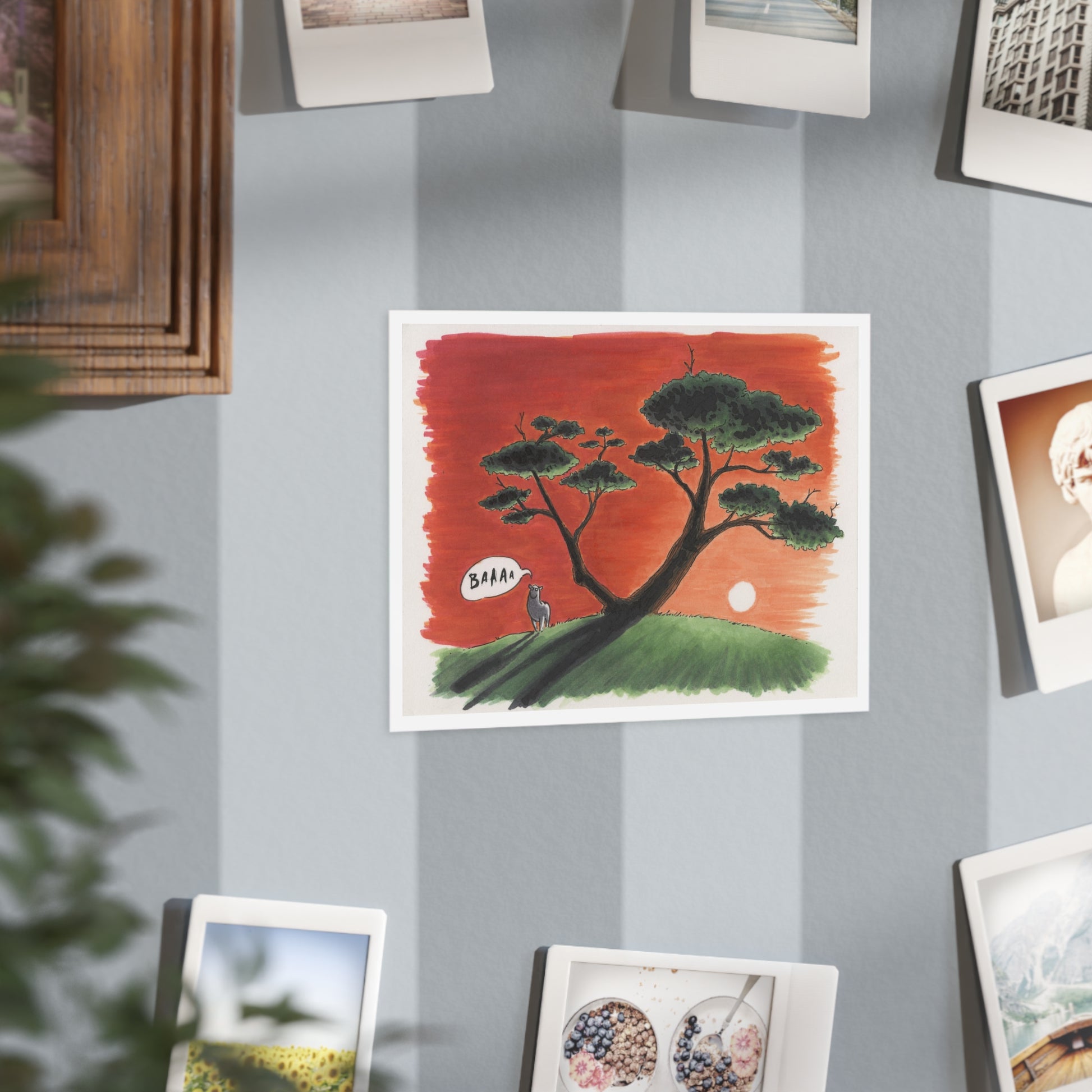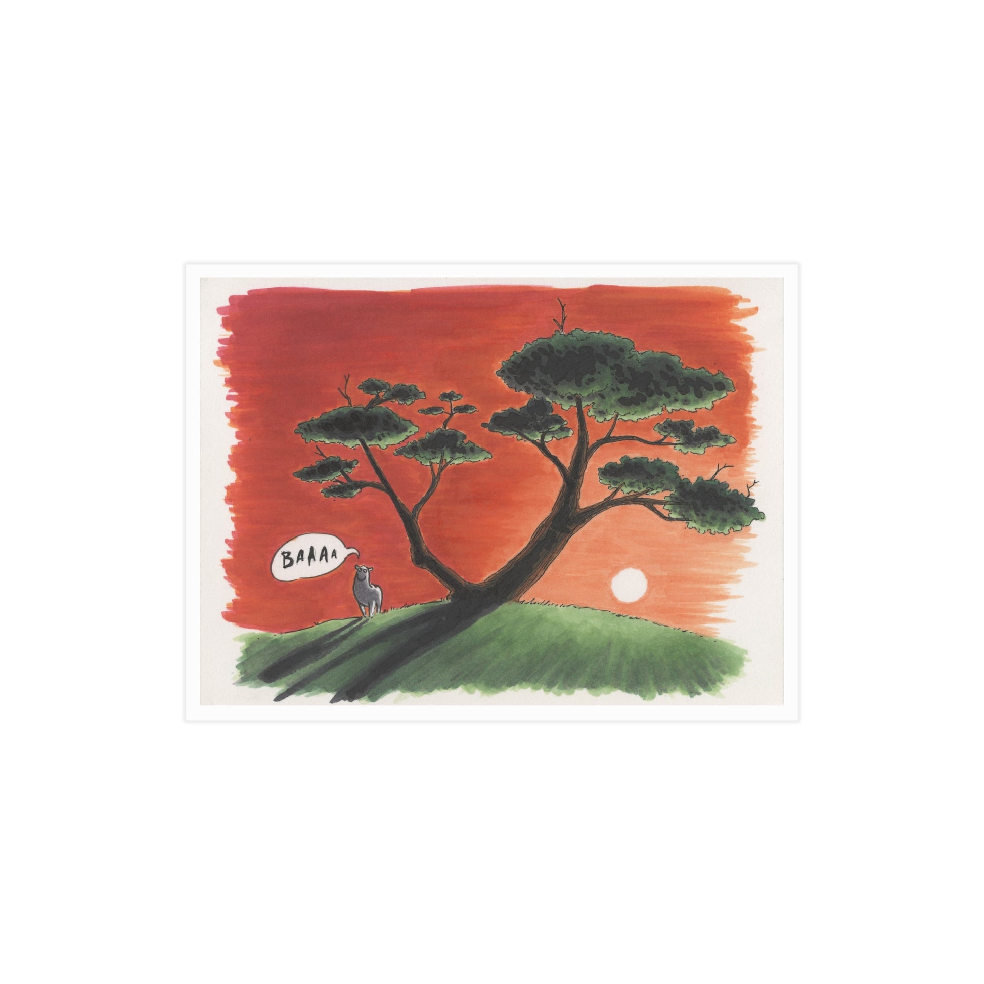 A quiet hillside at dusk — soft woolly shapes grazing beneath a twin-branched tree that reaches both sky and shadow. The red sunset stains the horizon, warming the scene with a slow, contemplative light. This unframed print brings that gentle moment into a living room, studio, or reading nook. It’s made to sit on a shelf or lean against a wall, inviting long glances and whispered stories. The composition feels both familiar and strange: pastoral calm with a little bit of wonder, the tree’s opposing branches suggesting choices, journeys, and the small surprises of countryside life. For someone who collects quiet scenes, loves pastoral imagery, or wants a calming focal point for evenings at home, this print settles the room without shouting.